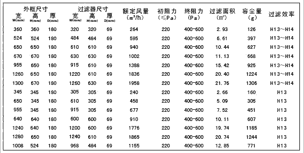可更換式一體化高效過(guò)濾器型號(hào)尺寸及其它參數(shù):
