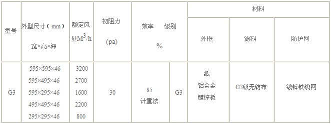 G3級初效過濾器技術參數:
