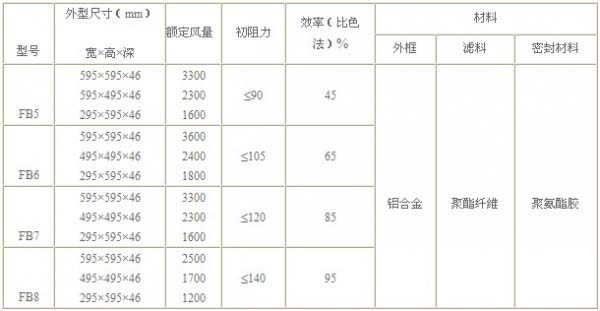 FB板式中效過濾器型號尺寸及其它參數: