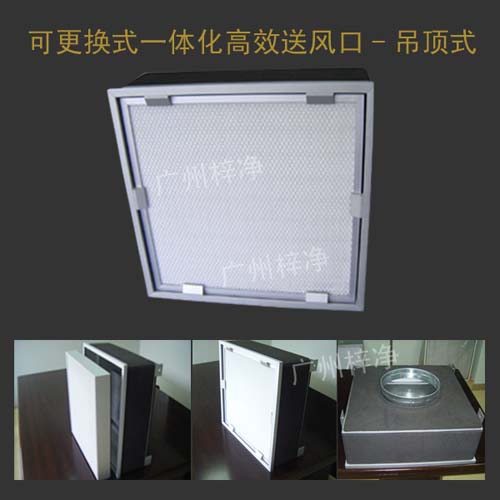 可更換式一體化高效送風(fēng)口:由靜壓箱和無隔板高效過濾器組成,采用鋁型材做靜壓箱,箱體內(nèi)置無隔板高效過濾器。該送風(fēng)口具有通風(fēng)性強(qiáng)、外形美觀、安裝更換方便、維護(hù)簡(jiǎn)單、投資少、重量輕、厚度薄、過濾效率高等優(yōu)點(diǎn)。